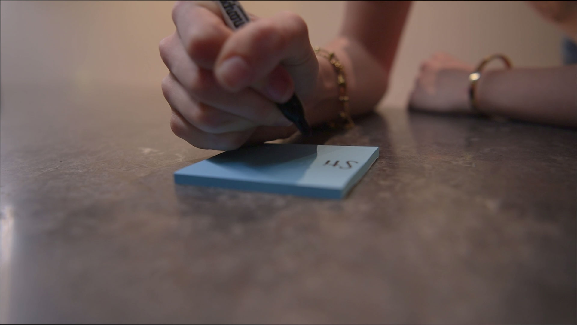 Close-up of a hand writing with a sharpie onto a blue sticky note.