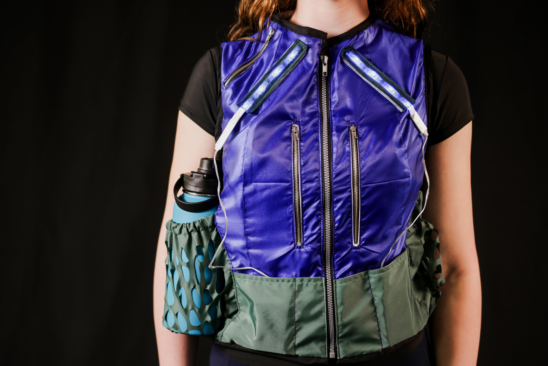 Mountain biking is a sport that requires the athlete to carry many items and tools with them. Current mountain biking apparel on the market lacks adequate storage for biking essentials. I have therefore designed this vest with storage in mind, incorporating several pockets of varying sizes to accommodate a range of mountain biking tools. The detachable battery-operated LED light panels enhance the wearer’s visibility and safety on the tracks, avoiding the need to bring a separate light source. The mesh panels located under the arm aid breathability and airflow, and the flexible laser-cut side pockets can carry almost any size drink bottle.
