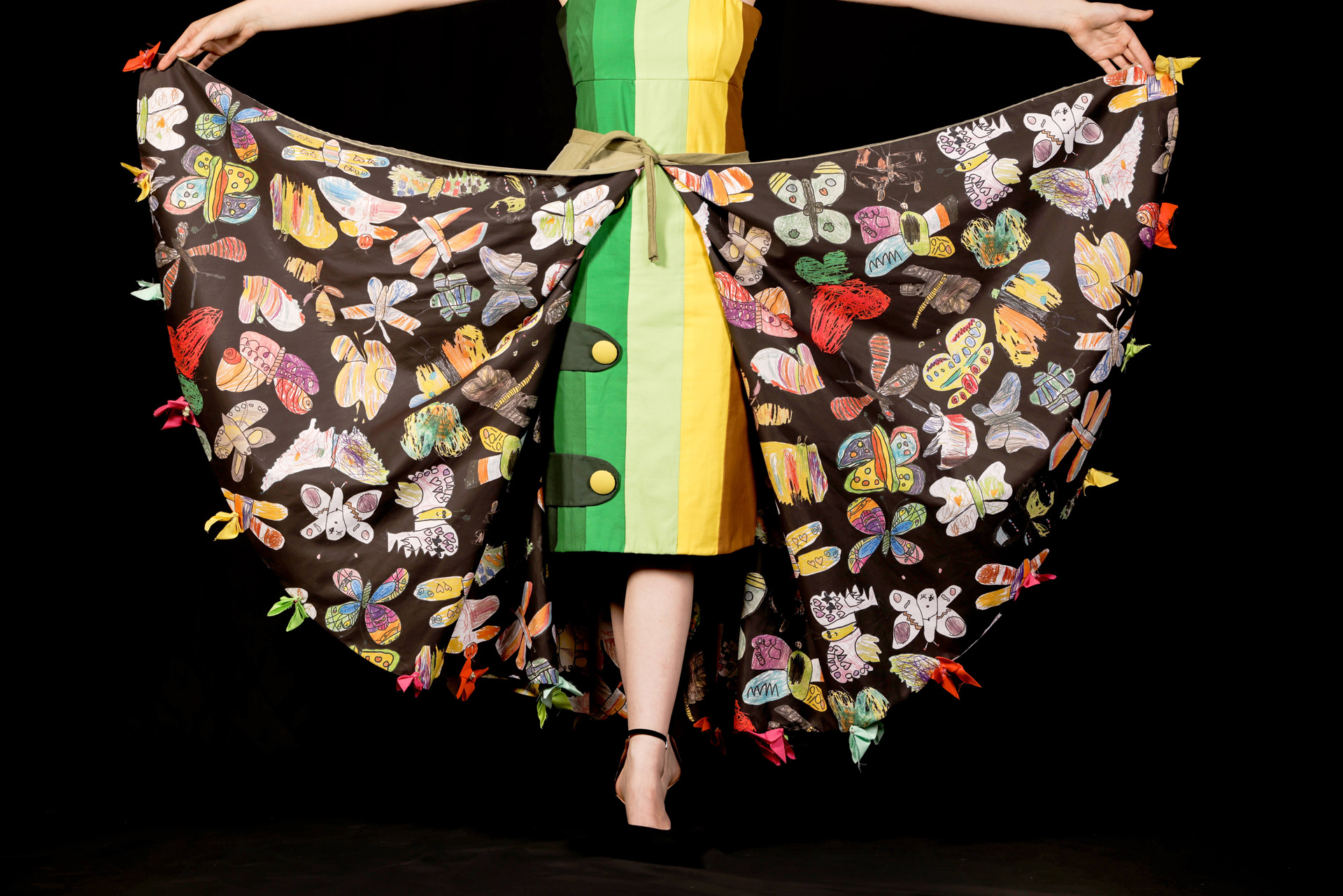 My design was developed as an educational tool to teach prep students the process of a butterfly's metamorphosis. The butterflies on the garment were drawn by prep students and then printed onto fabric. The garment was designed to engage these students, by reflecting on their own creative work. The transformation of the garment represents the three stages of a butterfly’s metamorphosis. The dress symbolises the caterpillar and the skirt represents the cocoon, which then transforms into a cape as the butterfly emerges.