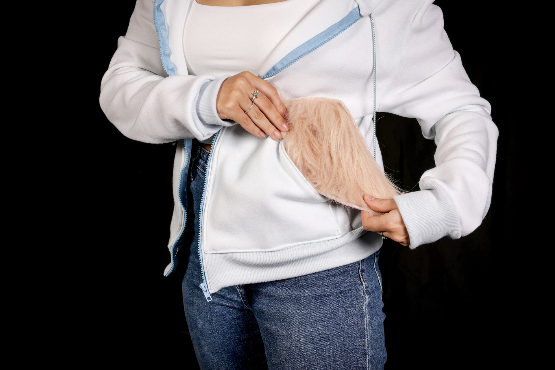 My gender-neutral hoodie design features fidget and soothing accessories to assist users in moderating their anxiety and/or other sensory needs discreetly in public. The interchangeable pocket inserts and compression elements can be removed and attached depending on the wearer's preferences. The soft, hand dyed fleece is a calming, neutral colour, offering another soothing feature for the wearer.