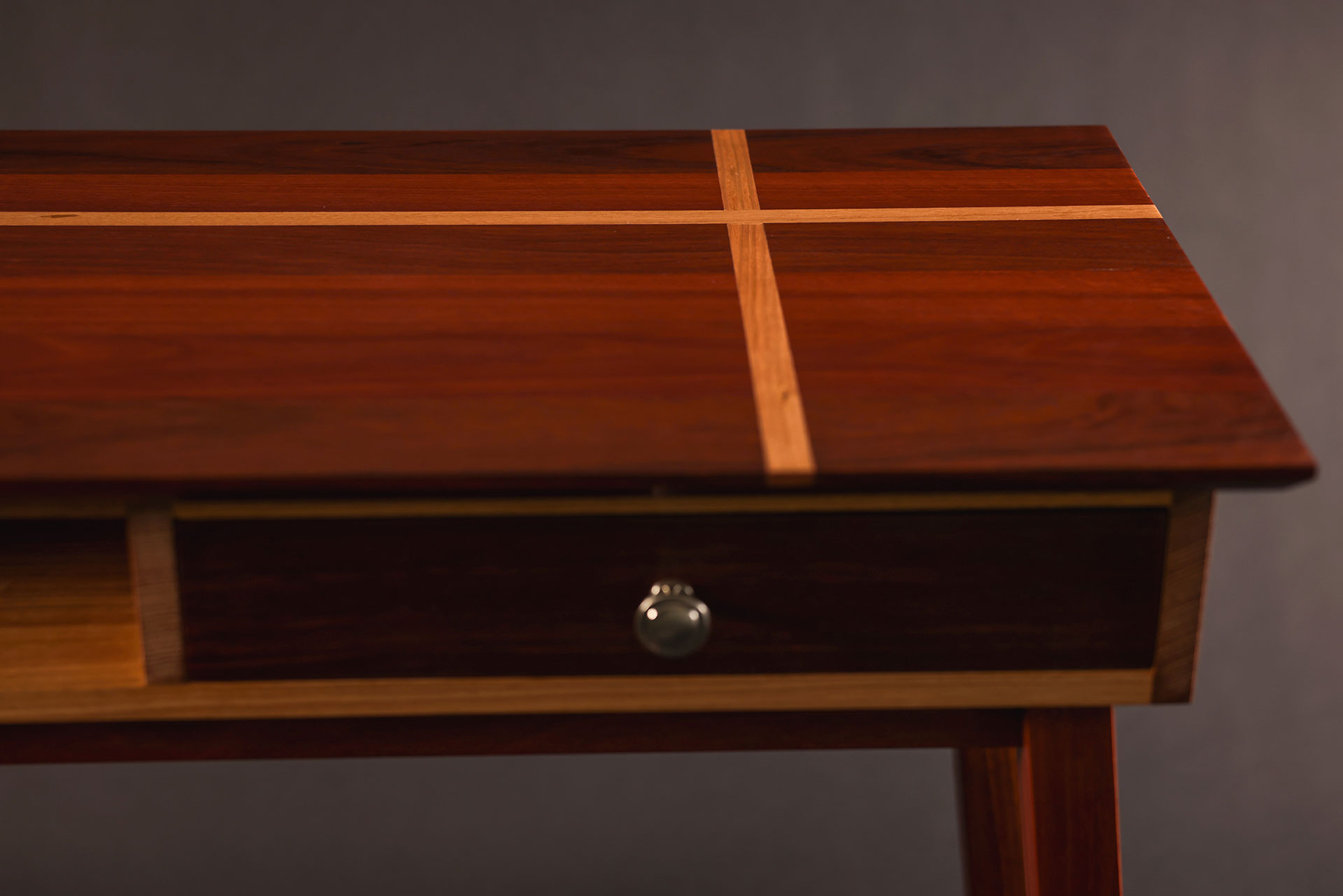 Close-up view of a wooden table that features a cross design on its top and an inset drawer with a silver handle.