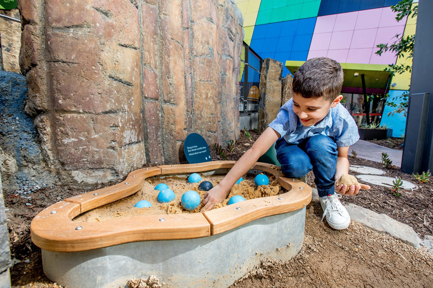 I can see and play with a dinosaur nest of Leaellynasaura eggs that has sand in it.