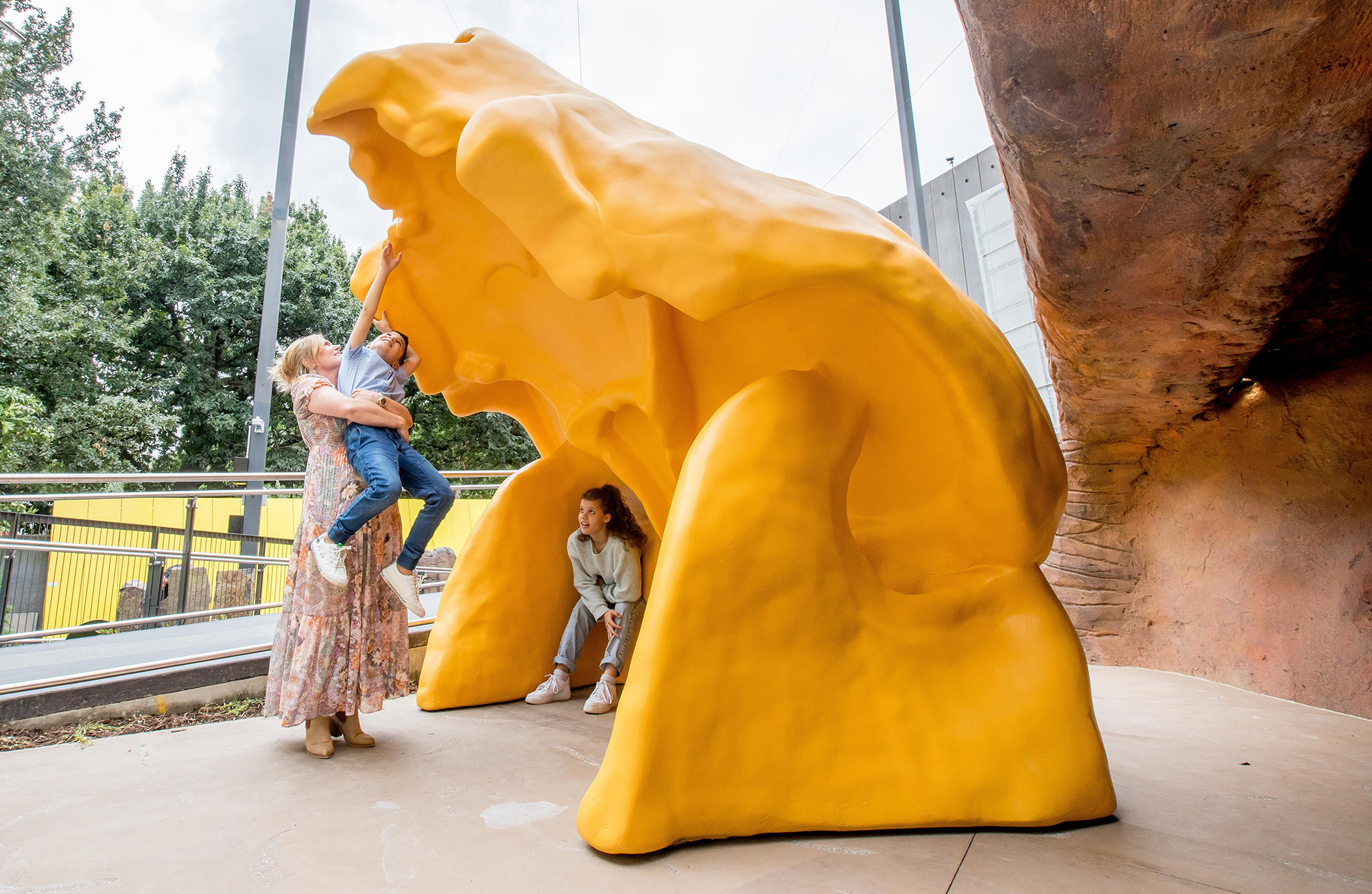 It looks like a lion but is an ancient marsupial. There is an enormous yellow replica of Thylacoleo’s skull.