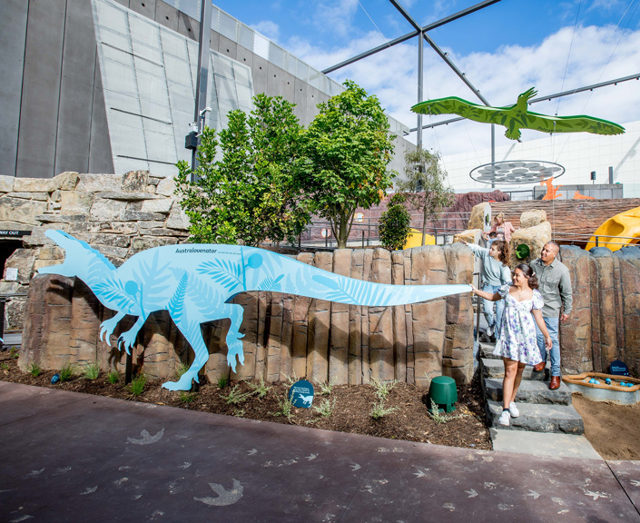 I will see shapes of a big dinosaur, Australovenator, and a smaller dinosaur, Leaellynasaura, who lived here millions of years ago.