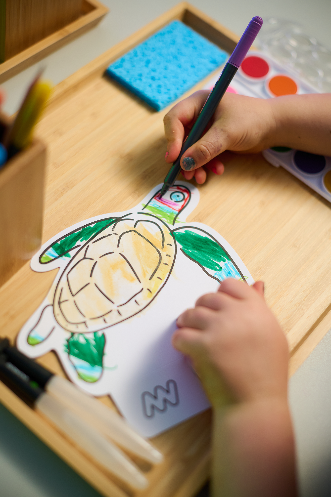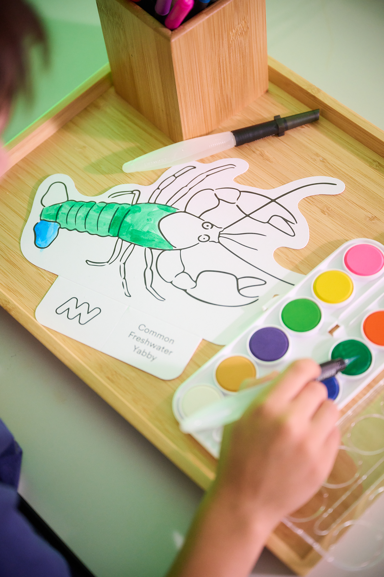 At the end of the video, the program host will ask another staff member to explain the next activity. At the maker tables I will be asked to colour a picture of an animal. On the tables there will be a wooden tray with: