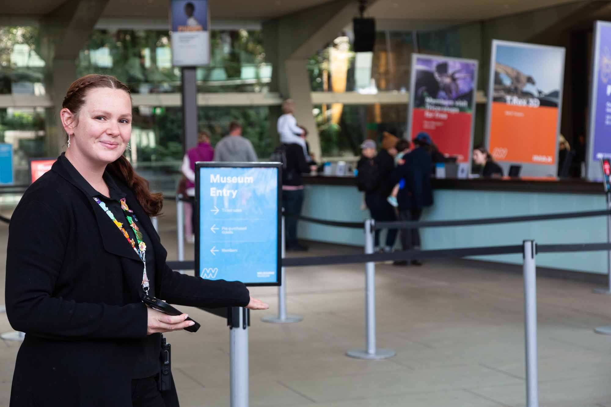 If I get lost, a Visitor Experience Officer can help me find my class. They wear black t-shirts and have coloured straps around their necks.