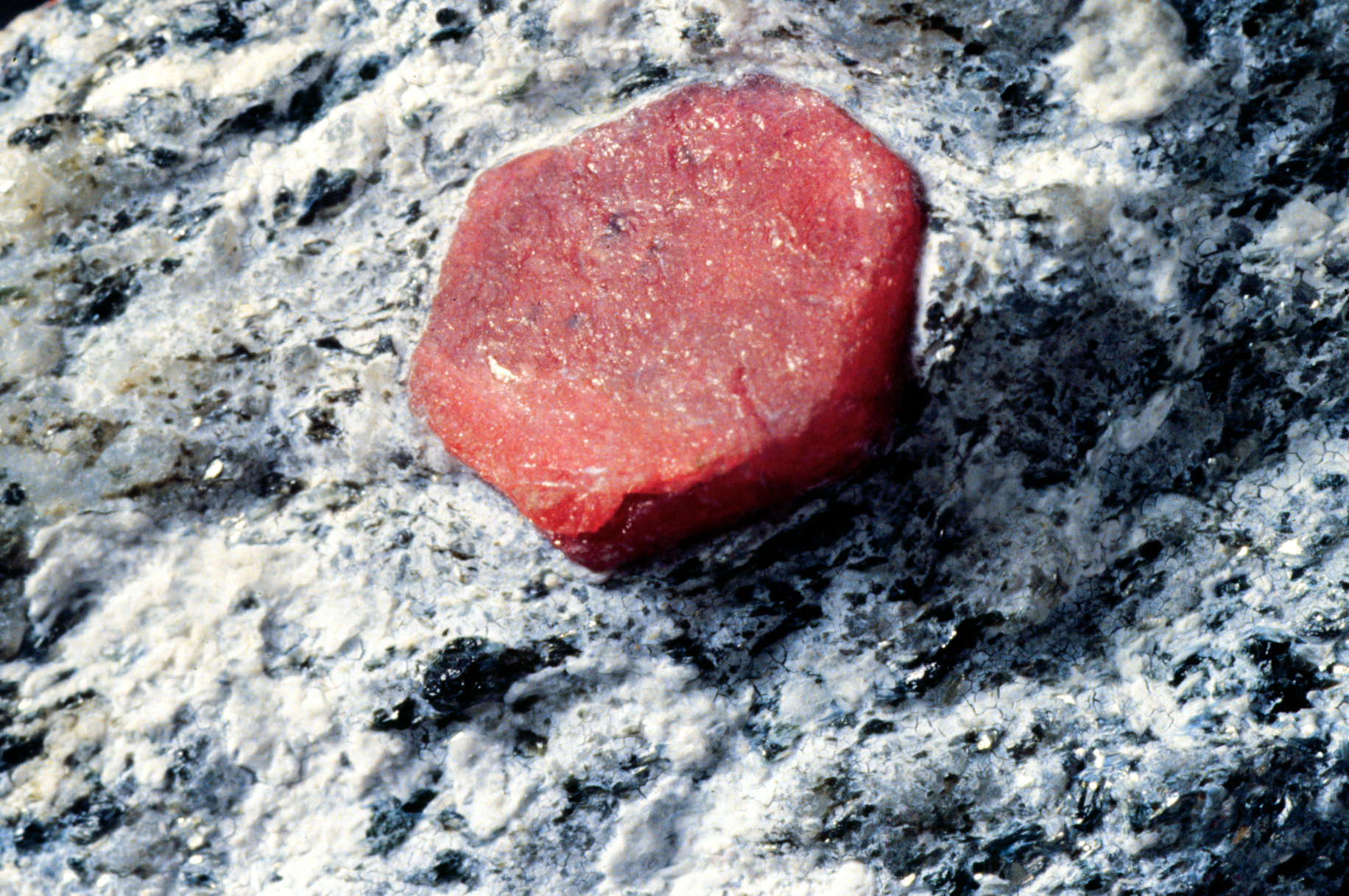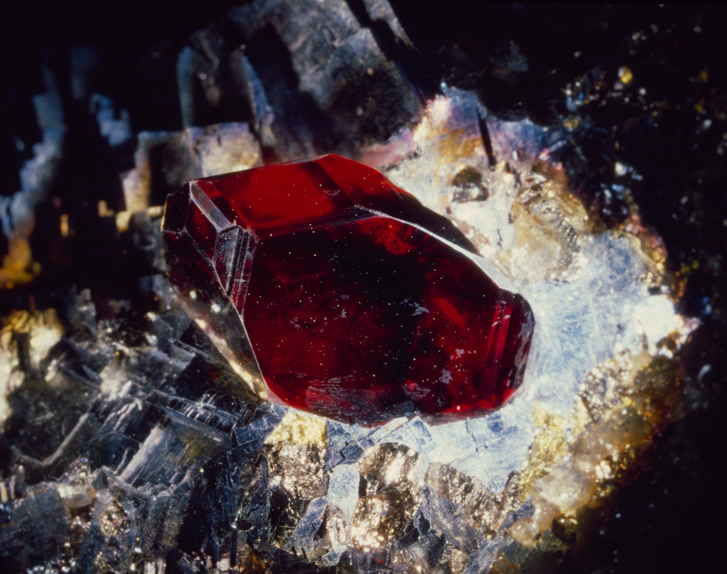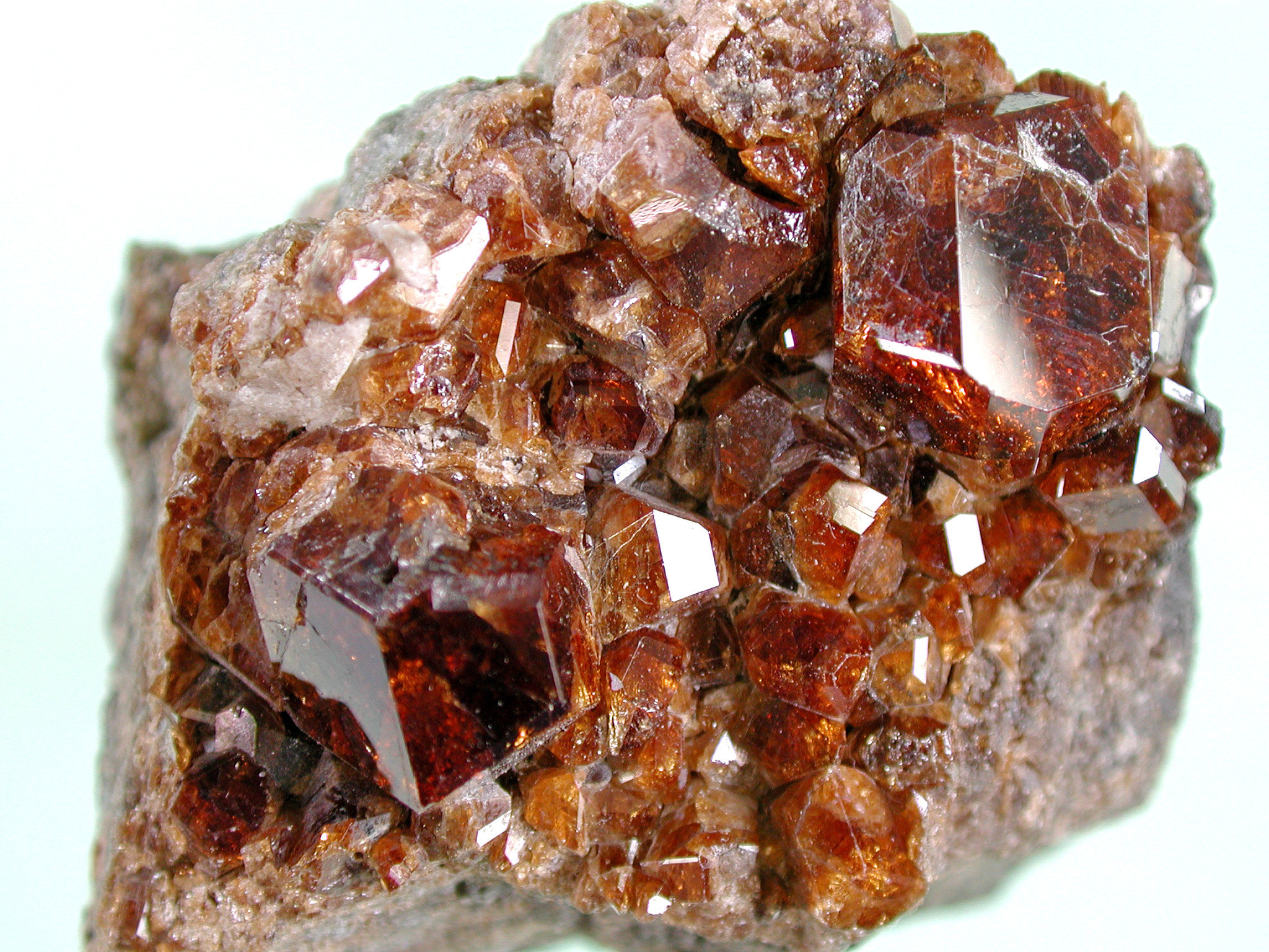 Garnets are popular gemstones. The different colours are the result of different chemical compositions. There are fourteen different types (or species) of garnets. They are among the most common minerals in metamorphic rocks, and provide clues to the conditions of metamorphism.