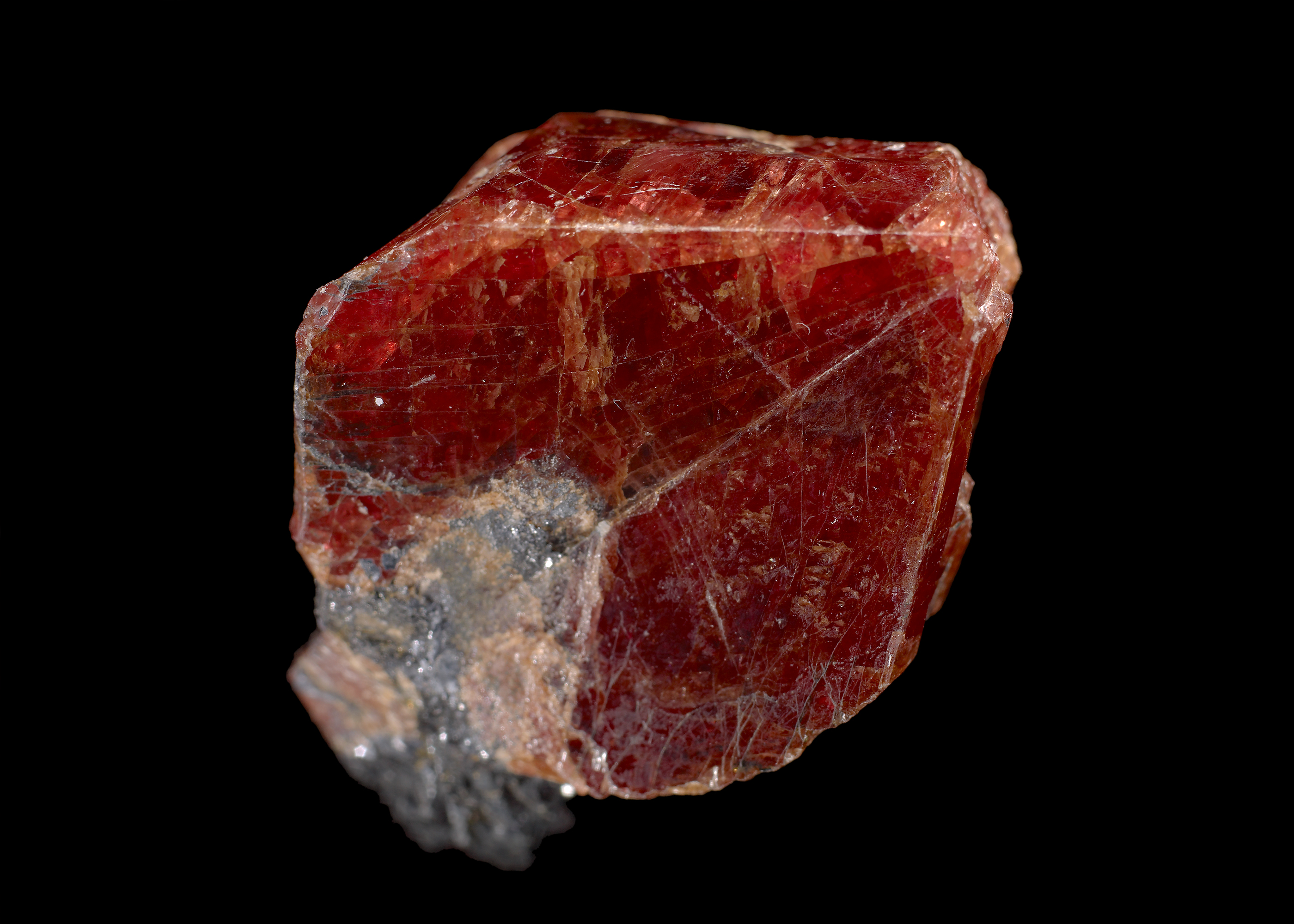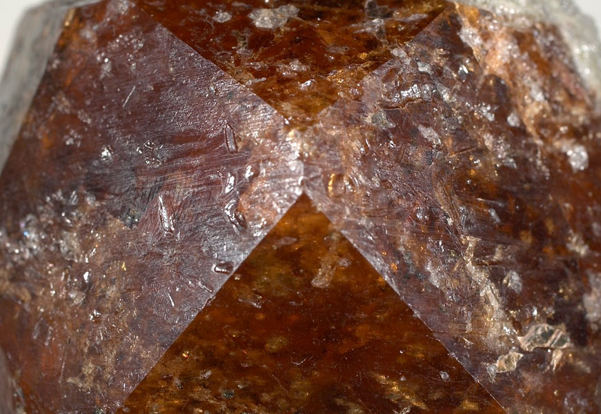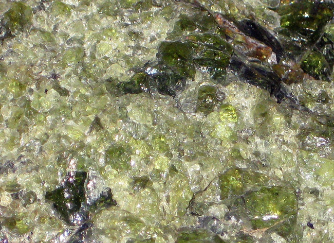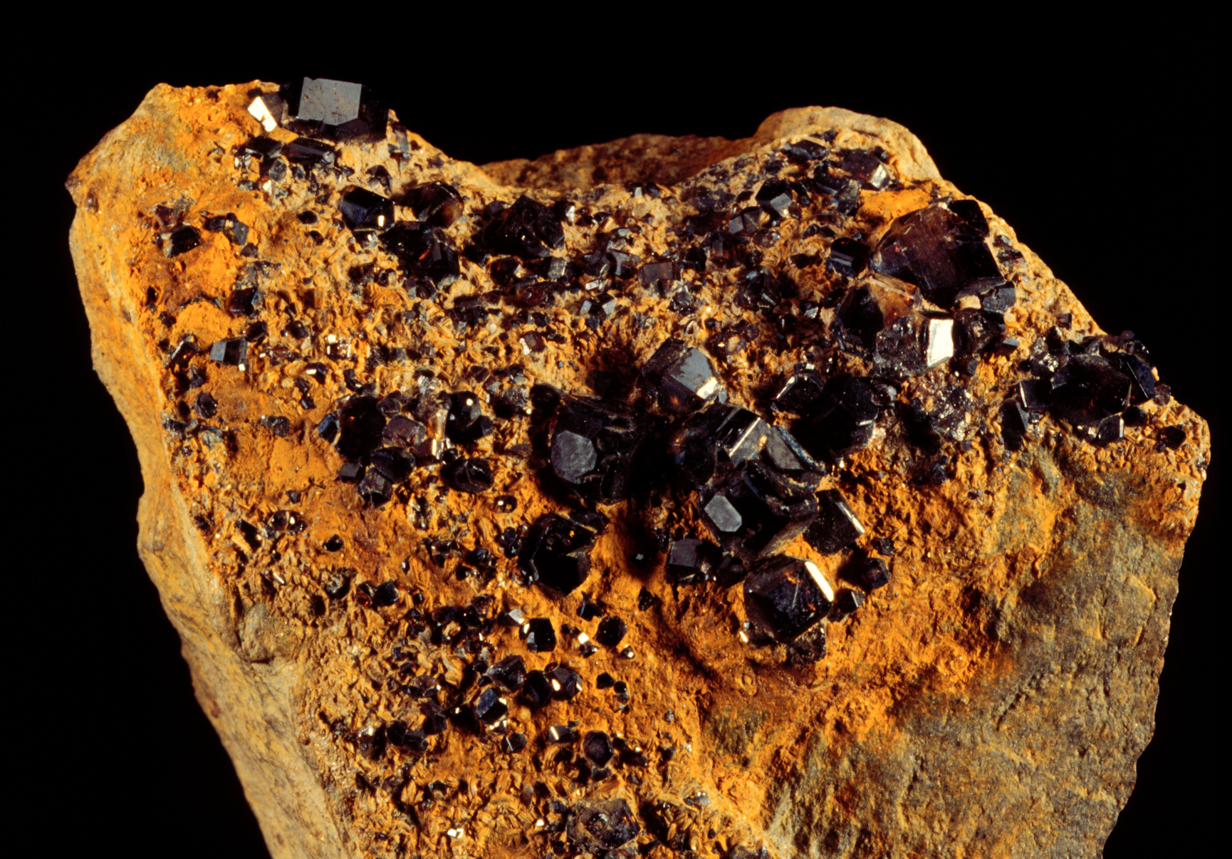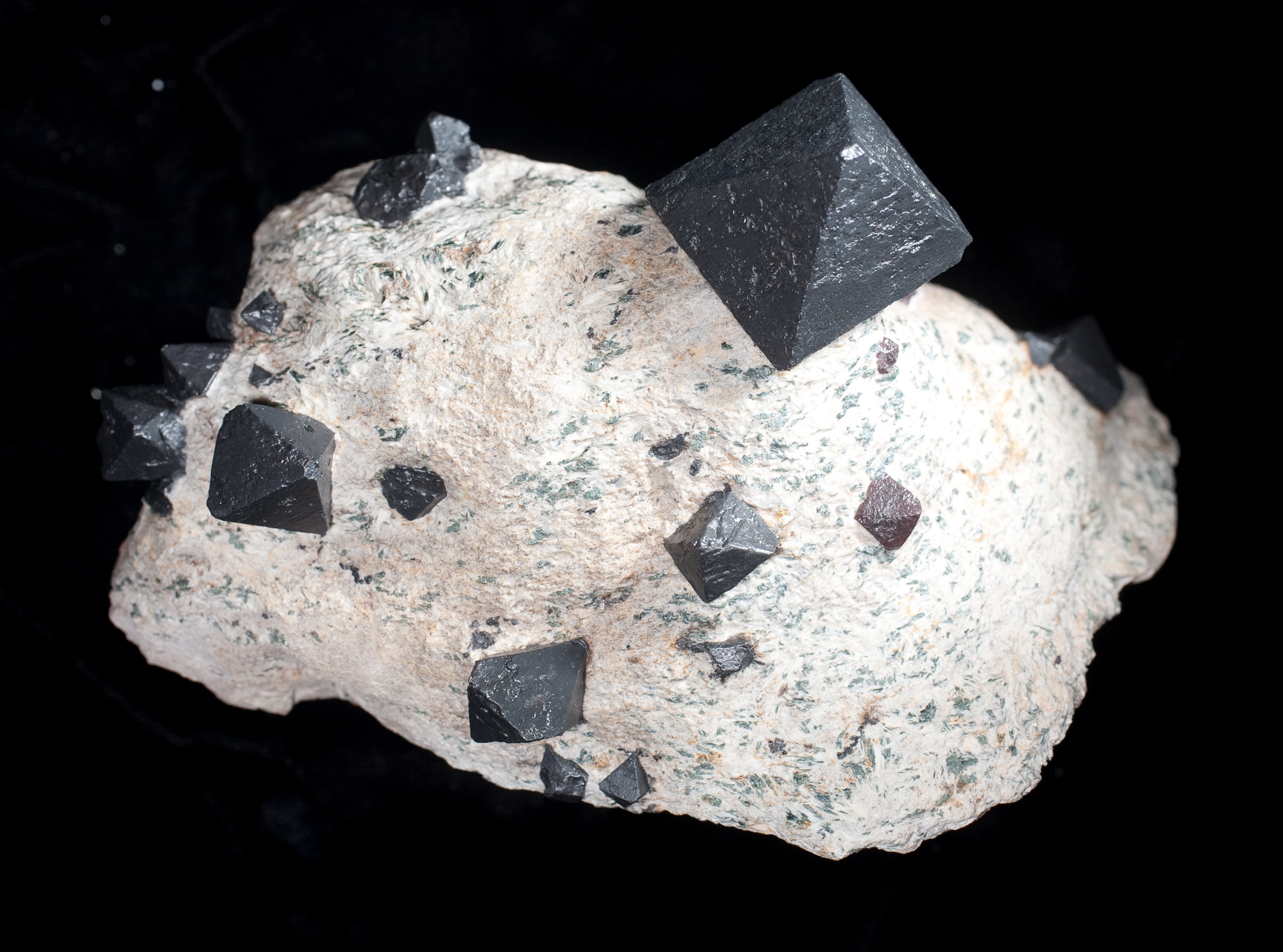 Garnets are popular gemstones. The different colours are the result of different chemical compositions. There are fourteen different types (or species) of garnets. They are among the most common minerals in metamorphic rocks, and provide clues to the conditions of metamorphism.