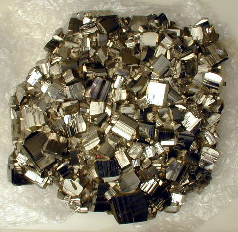 Almost all minerals are crystalline, which means they are made up of atoms that are arranged in a three-dimensional lattice. Each mineral has different elements present in regular proportions. For example, pyrite has one iron atom for every two sulfur atoms; its chemical formula is FeS2.