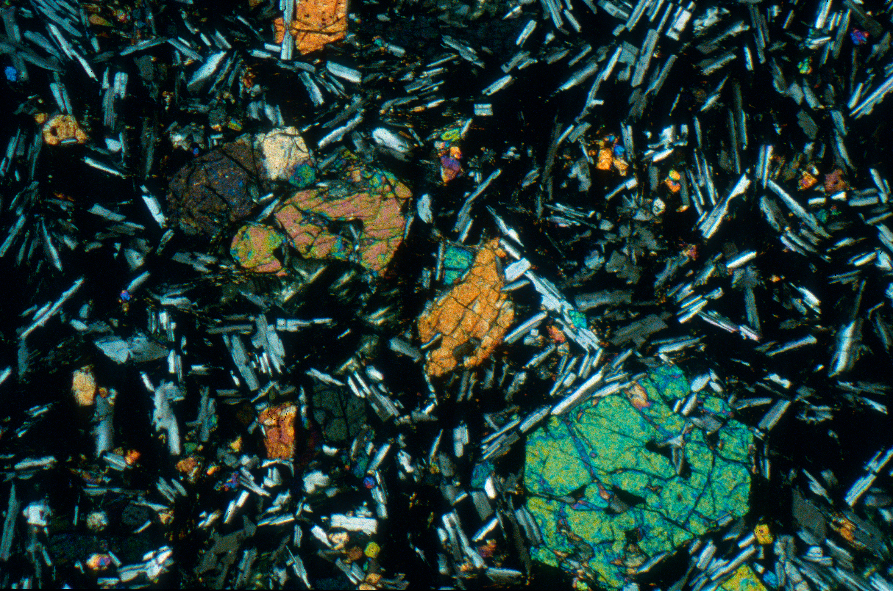 Basalt is the most abundant volcanic rock in the Earth’s crust. It is made up of tiny crystals of olivine, pyroxene, amphibole and feldspar. Lava that forms basalt erupts at over 1000°C and is very fluid, so it can flow great distances from a volcano.