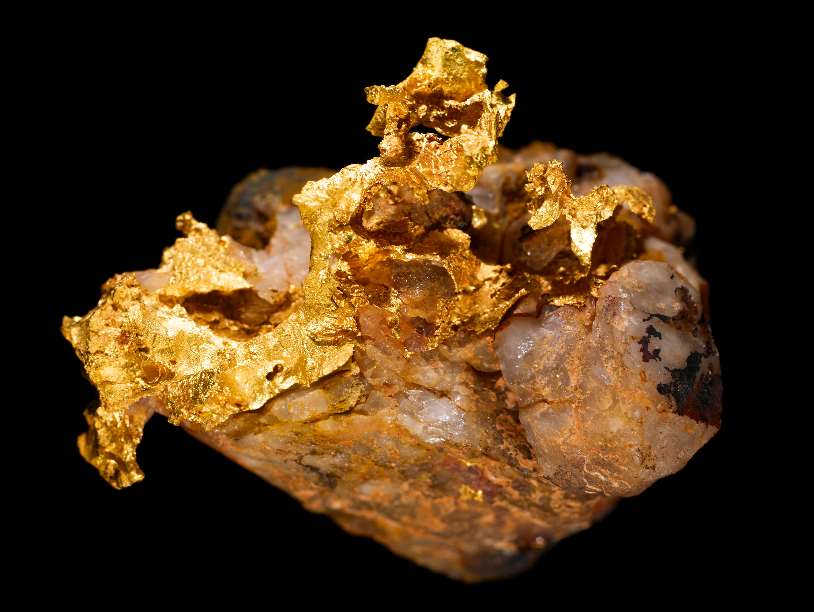 Gold nuggets form deep underground, where hot fluids deposit gold and quartz in reefs. After millions of years of erosion these reefs are exposed, the quartz is broken down and the gold is washed out. Gold is inert so it remains in soil and streambeds, where it can be found – Eureka!
