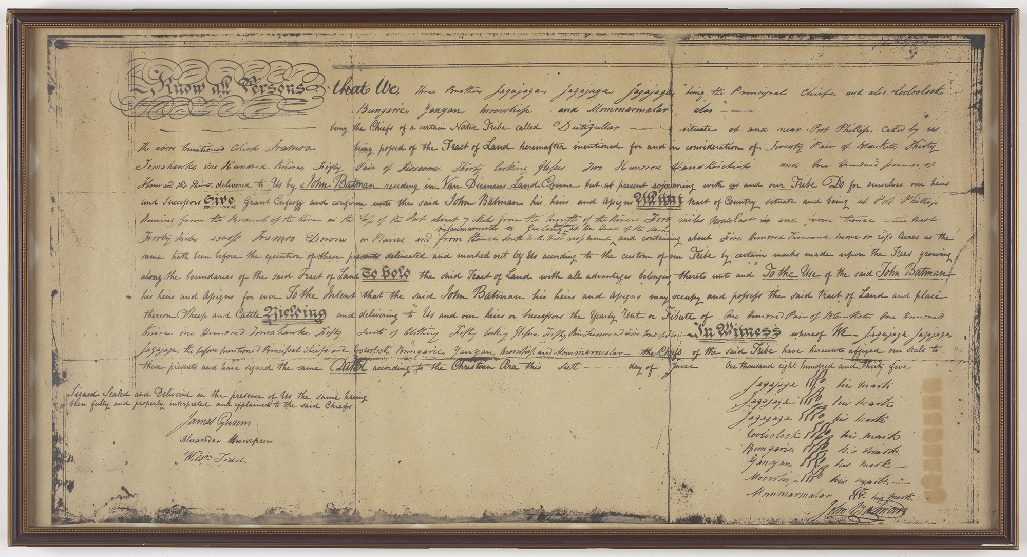 In May 1835, a syndicate led by John Batman explored Port Phillip Bay, looking for suitable sites for a settlement. Batman claimed to have signed a 'treaty' with Indigenous leaders, giving him ownership of almost 250,000 hectares of land in exchange for 20 blankets, 30 tomahawks, 100 knives, 50 pairs of scissors, 30 looking glasses, 200 handkerchiefs, 100 pounds of flour and six shirts. This treaty is the only known land use agreement that attempted to recognise land rights prior to European settlement in Australia.2