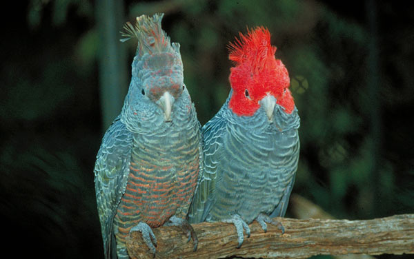 Gang-gang Cockatoos are sturdy, medium-sized birds with short tails and broad wings. Their mottled grey plumage contrasts with the shock of crimson feathers on the heads of male birds. Females have reddish feathers on their undersides.