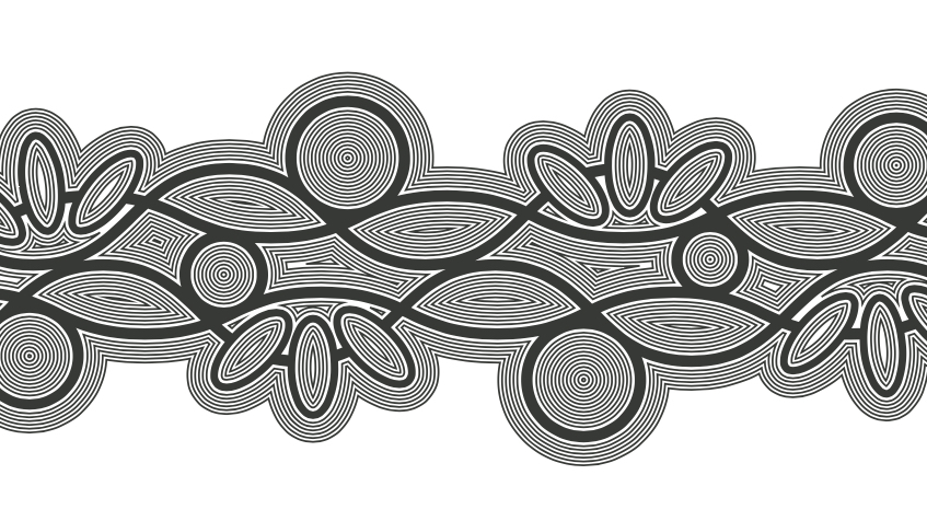 Designer Dixon Patten developed the visual motif that underpins all of the design in Biik Milboo Dhumba | Country Is Always Talking. Dixon explains that the interwoven patterns represent the connection of culture and Country, featuring ovals that symbolise seedlings that grow to become plants, just as three different sized circles bring to mind the growth of communities.