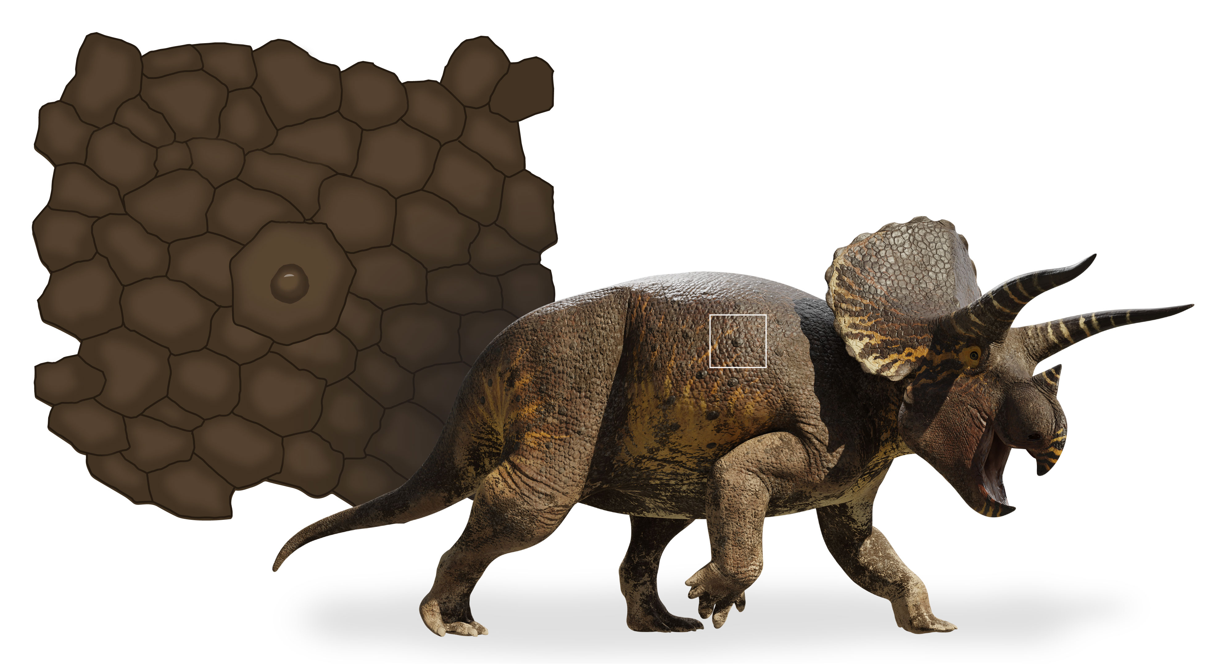 From fossilised skin impressions we can tell that Triceratops horridus had hexagonal scales across its body. There were also some larger scales with a raised point in the middle.