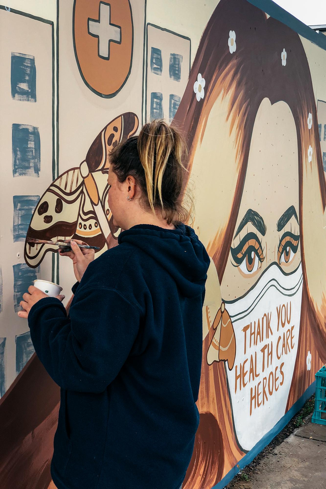 Justine’s mural work always begins with a conceptual framework. Her decision to incorporate butterflies into this piece was ‘to represent change through something as beautiful as a butterfly.’ The mural’s soft and earthy colour tones were inspired by the natural environment surrounding the mural, and the female character was loosely based on a photograph that she had taken. She reflects, ‘I believe that we’re all playing characters in a grand concert called life, although we all wore masks for coronavirus, I think we’re always wearing masks. The characters I paint are built off real people I’ve encountered. The female I painted for the healthcare workers mural is simply a woman of the earth saying thank you.’