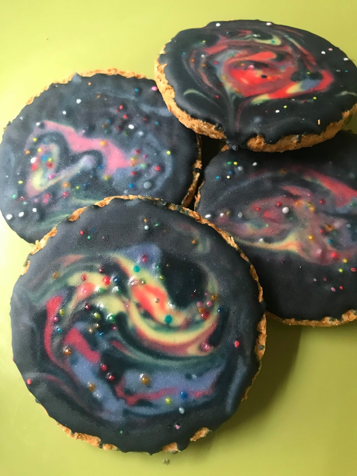A galaxy is a huge collection of billions of stars and their solar systems, plus gas and dust all held together by gravity. There are a few common galaxy shapes- the Milky Way is spiral-shaped while others are elliptical or irregular. They are very colourful and are excellent inspiration for decorating biscuits or even cupcakes!