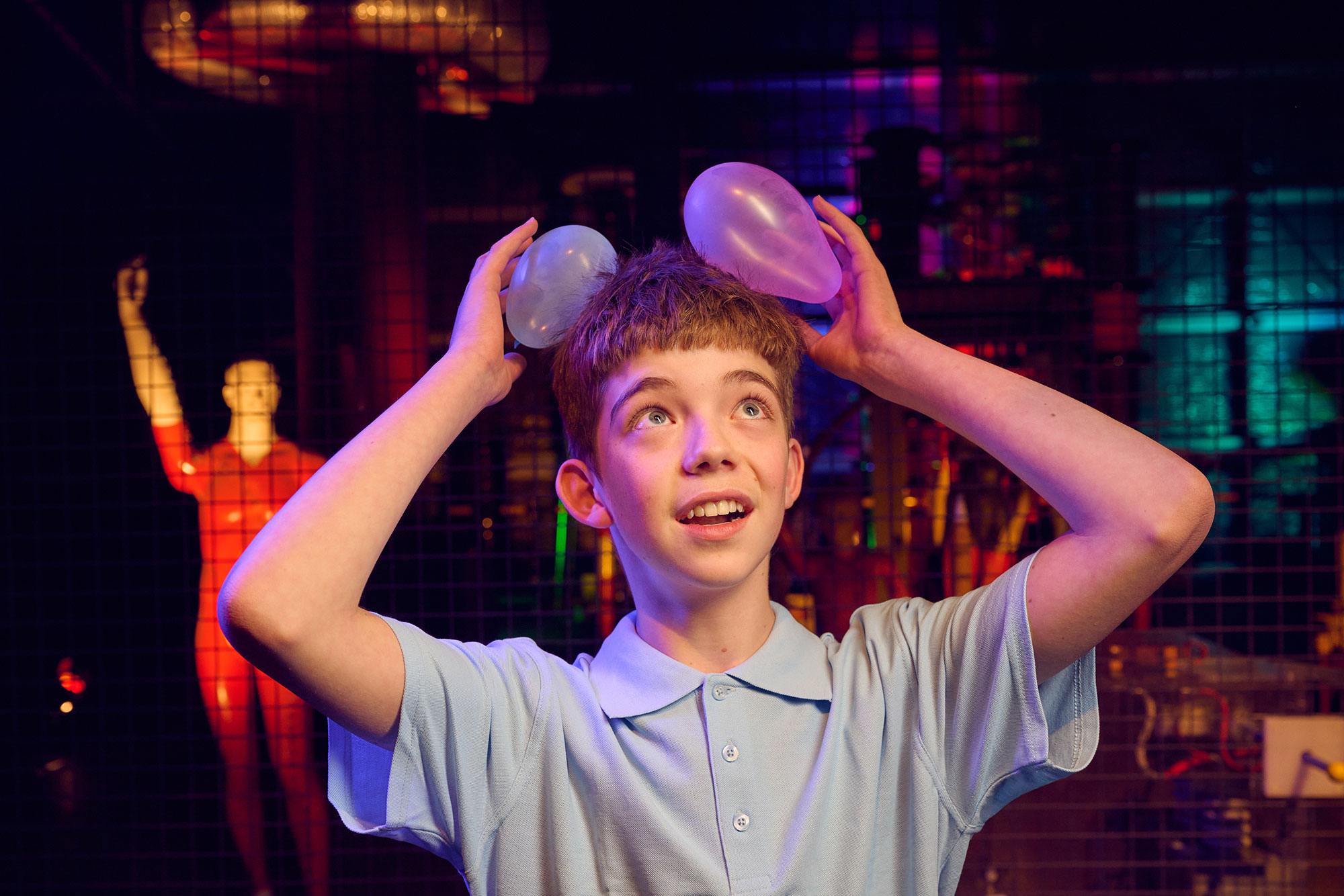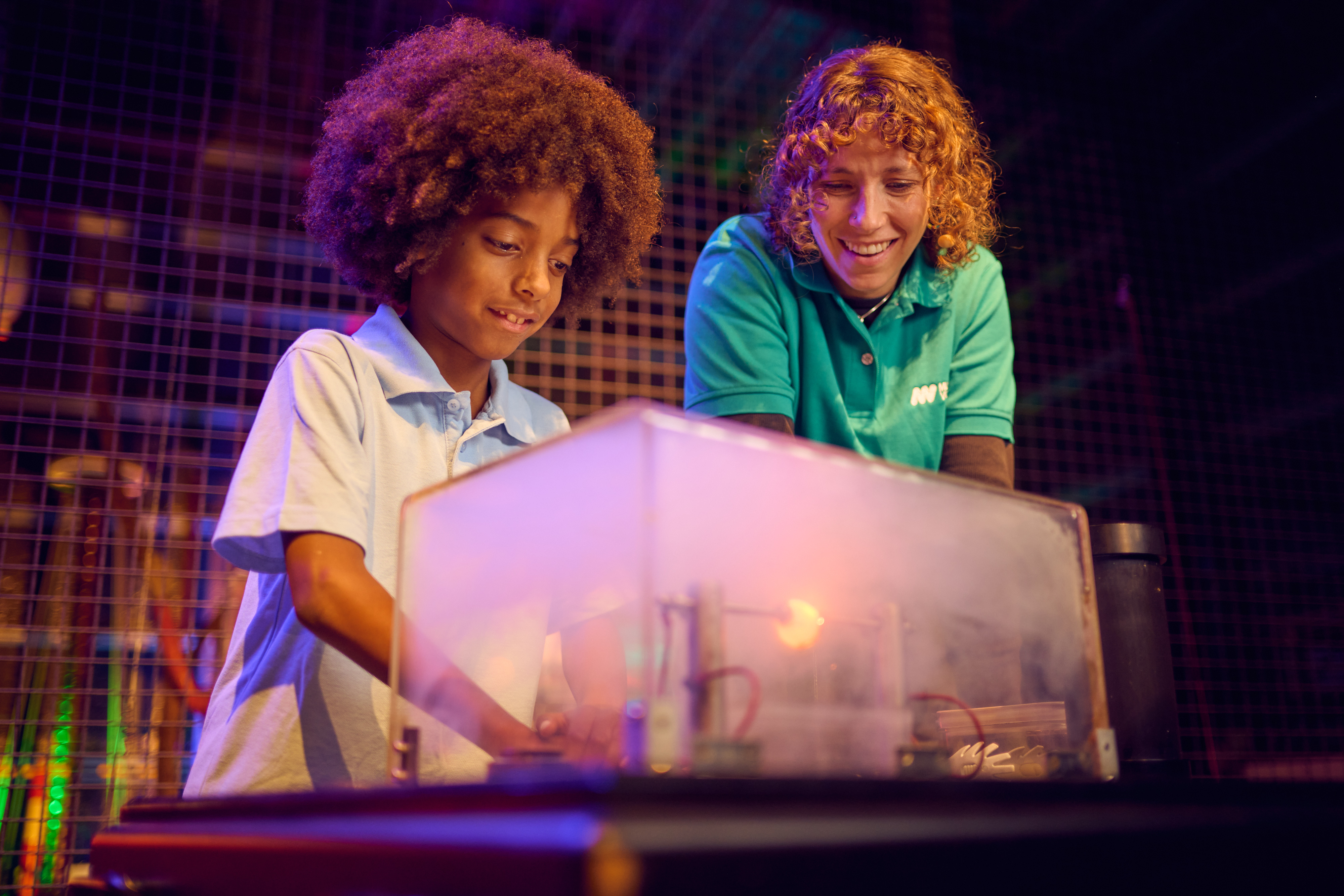 A child does a science experiment with a huge lightbulb in the Lightning Theatre at Scienceworks.