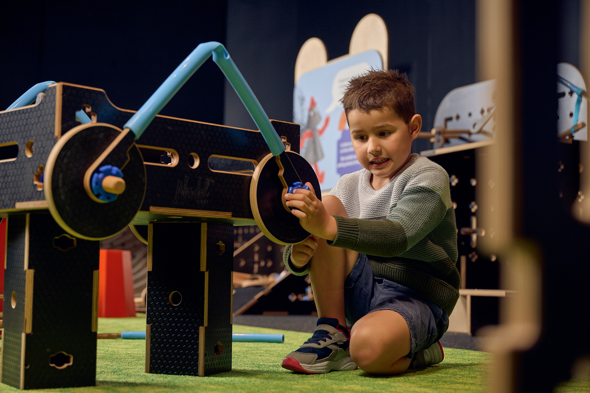 The workshop is an area where I can build with loose parts. There are wooden boxes and wheels and connectors and lots of interesting materials. I can build something on the ground, or I can use the walls and tables as a launch point.
