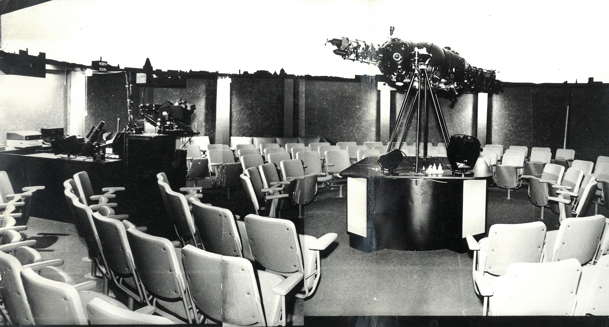 Rows of circular seating gave a capacity of 117 with the operator console located to one side. Public shows were largely live and could display around 5000 stars visible to the naked eye (typically up to 6th magnitude in dark sky conditions). Sessions could cover sunsets and sunrises, clouds, seasonal constellations, the progression and retrograde motion of planets, the moon’s motion and lunar phases, Earth’s diurnal and annual motion, precession, changes of latitude, the band of the Milky Way, comets, satellites, major nebulae and star clusters, and solar and lunar eclipses. Commentary, music and sound effects enhanced the visitor experience. Shows typically began by simulating dusk with a city skyline panorama followed by twilight fading into full night. A session often took visitors through to sunrise the next morning. Sessions were often themed and often captured topical events. Use was made of multiple slide projectors, turntable audio and later reel-to-reel tape and cassette tapes, and even 8mm or 16mm movie projection.