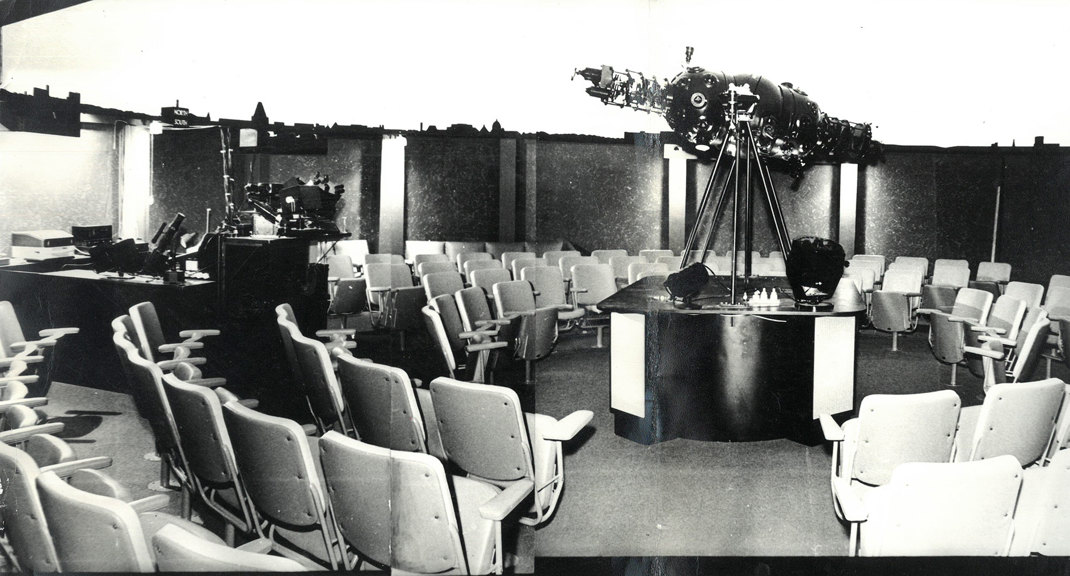 Constructed as a first-floor extension over the internal south-west courtyard of the building, the H V McKay Planetarium was reached through the Queens Gallery. Once inside visitors were greeted by a central Japanese GOTO Medium Model M-1 projector standing on two tripod supports under a dome 2.2 metre high and 10 metre wide. The GOTO displayed both northern and southern hemispheres to provide the entire night sky. Its 34 focussing lenses fitted with apertures would, as the projector moved or rotated, open and allow light from its internal lamps to pass through finely etched discs giving sharp images of stars or other phenomena on the dome above. A number of auxiliary projectors simulating meteors, comets, satellites, aurora, rainbows, eclipses, constellations, lightning, and planetary motion were located around the dome or at the control console. They added their own effects as did multiple slide projectors placed out of sight around the dome.6