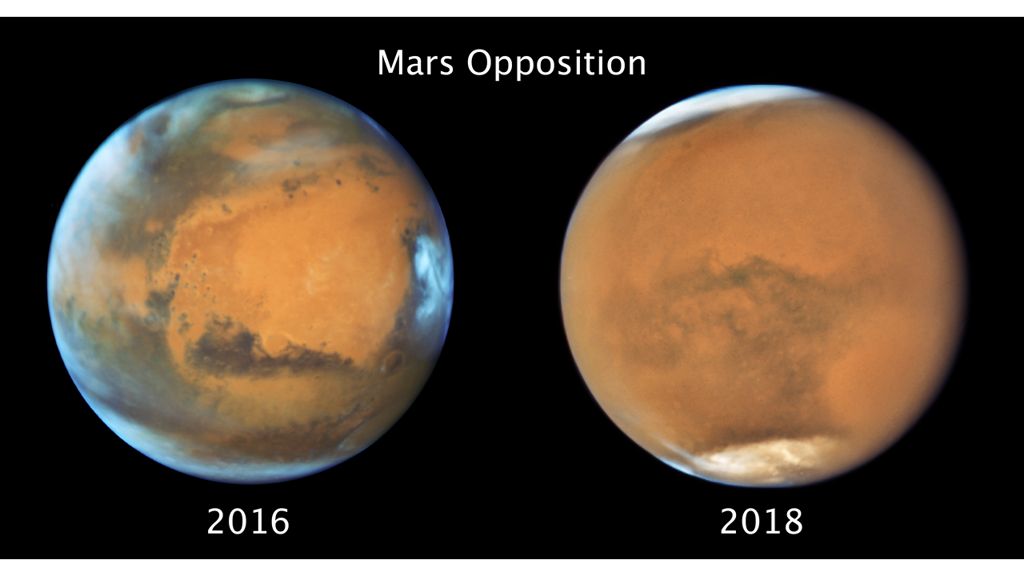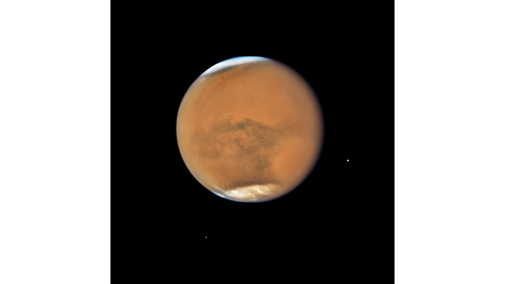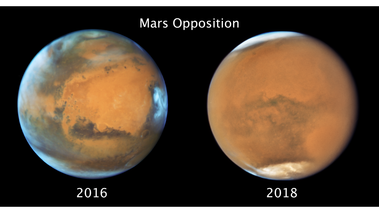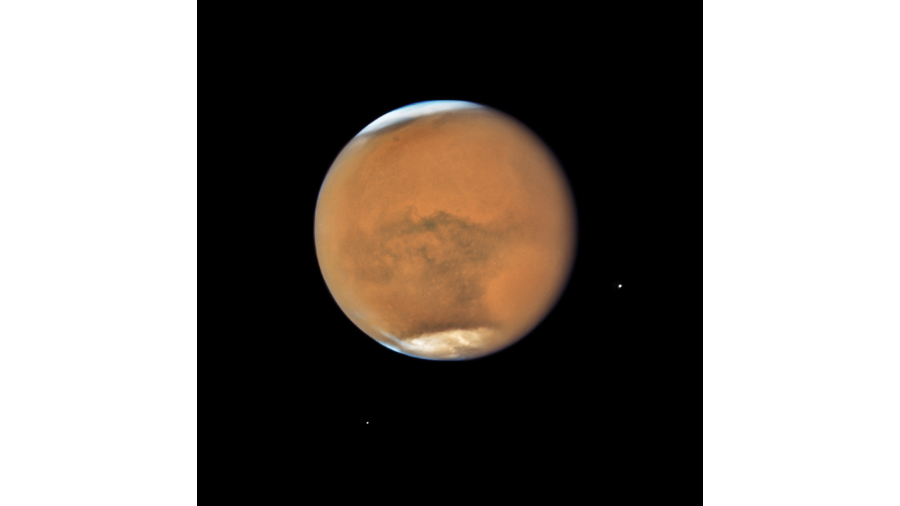 This month Mars will be easily visible every night, weather permitting. With Earth on an inner faster track around the Sun making two orbits for Mars’ one, a line-up of Sun, Earth and Mars occurs roughly every 24 months. This brings the Red Planet into Opposition - opposite the Sun from our point of view. At these times Mars is at its largest, brightest and closest to Earth. While Mars is smaller than Earth and further from the Sun, and receives less solar energy, it does share a similar day length and axial tilt which brings seasonal changes to its surface, polar caps, and thin carbon dioxide atmosphere.