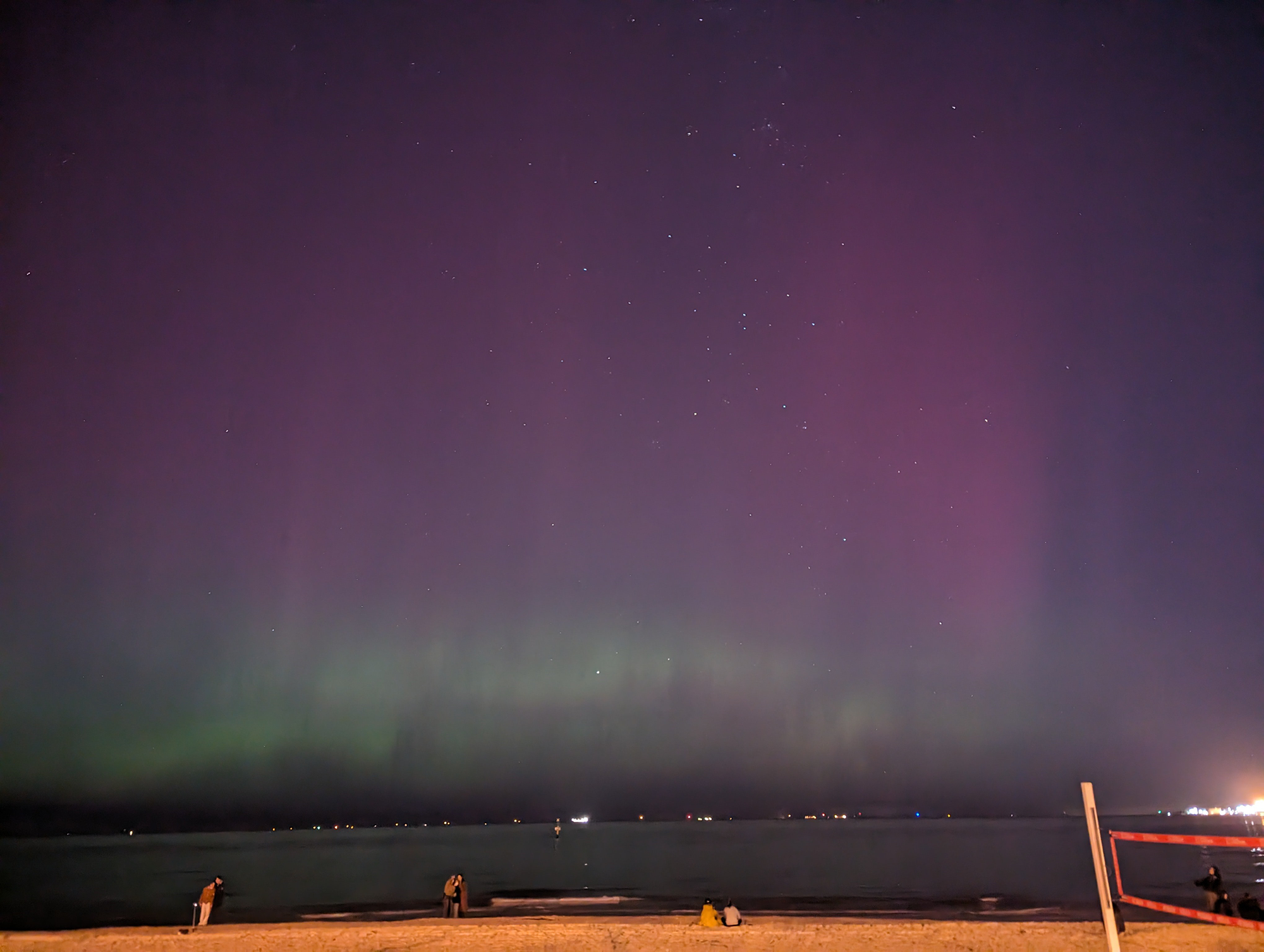 Auroras typically occur at between 100 to 300 km altitude and sometimes as high as 600 km. Colours are green from oxygen, pink from nitrogen, red from higher altitude oxygen, and blue or purple from hydrogen and helium (although these last two are not easily seen). The auroras occur at all times but are best seen on clear nights when they can be a spectacular sight.