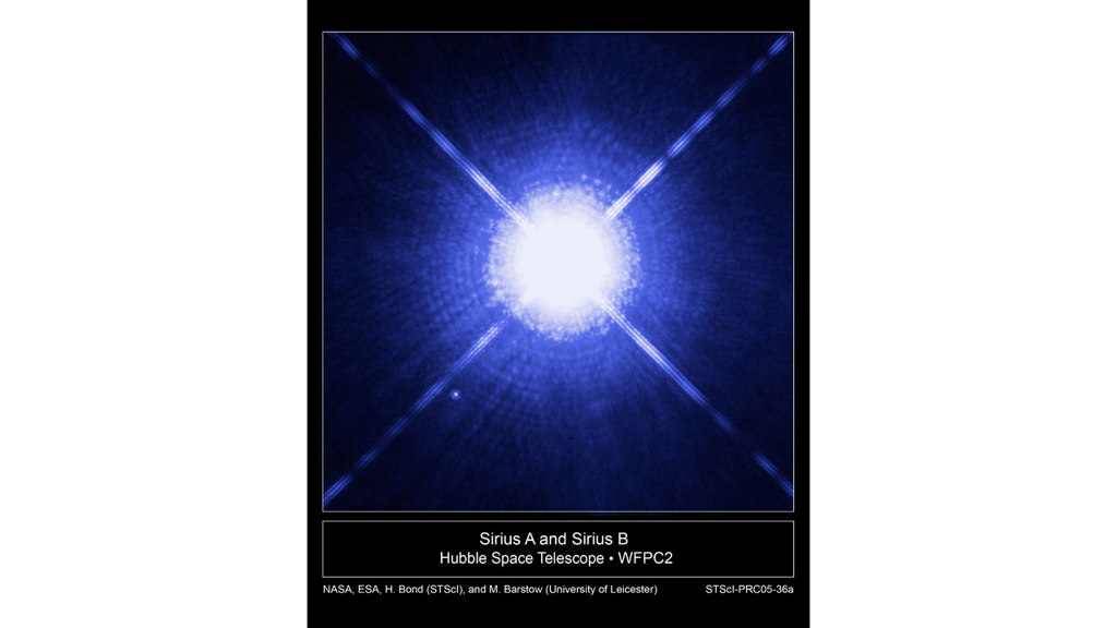 Sirius is, however, a binary system. Sirius A is twice the mass of our sun, almost 17 times as large and 25 times as luminous. Small faint Sirius B, however, was once a star similar to our Sun but in its late evolution it lost its outer layers to leave behind an extremely hot dense remnant core, a white dwarf, a little smaller than the Earth but with the mass almost that of the Sun. Sirius A and B orbit their mutual centre of mass every 50 years.
