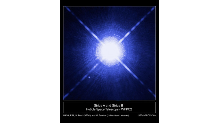 An overexposed 2003 Hubble Space Telescope image of the Sirius binary system designed to reveal Sirius A’s very faint companion, Sirius B, which can be seen at lower left. The spikes and ring patterns radiating from Sirius A are by-products of the telescope imaging system. Credit: NASA, ESA, H. Bond (STScI), M. Barstow (Uni of Leicester).