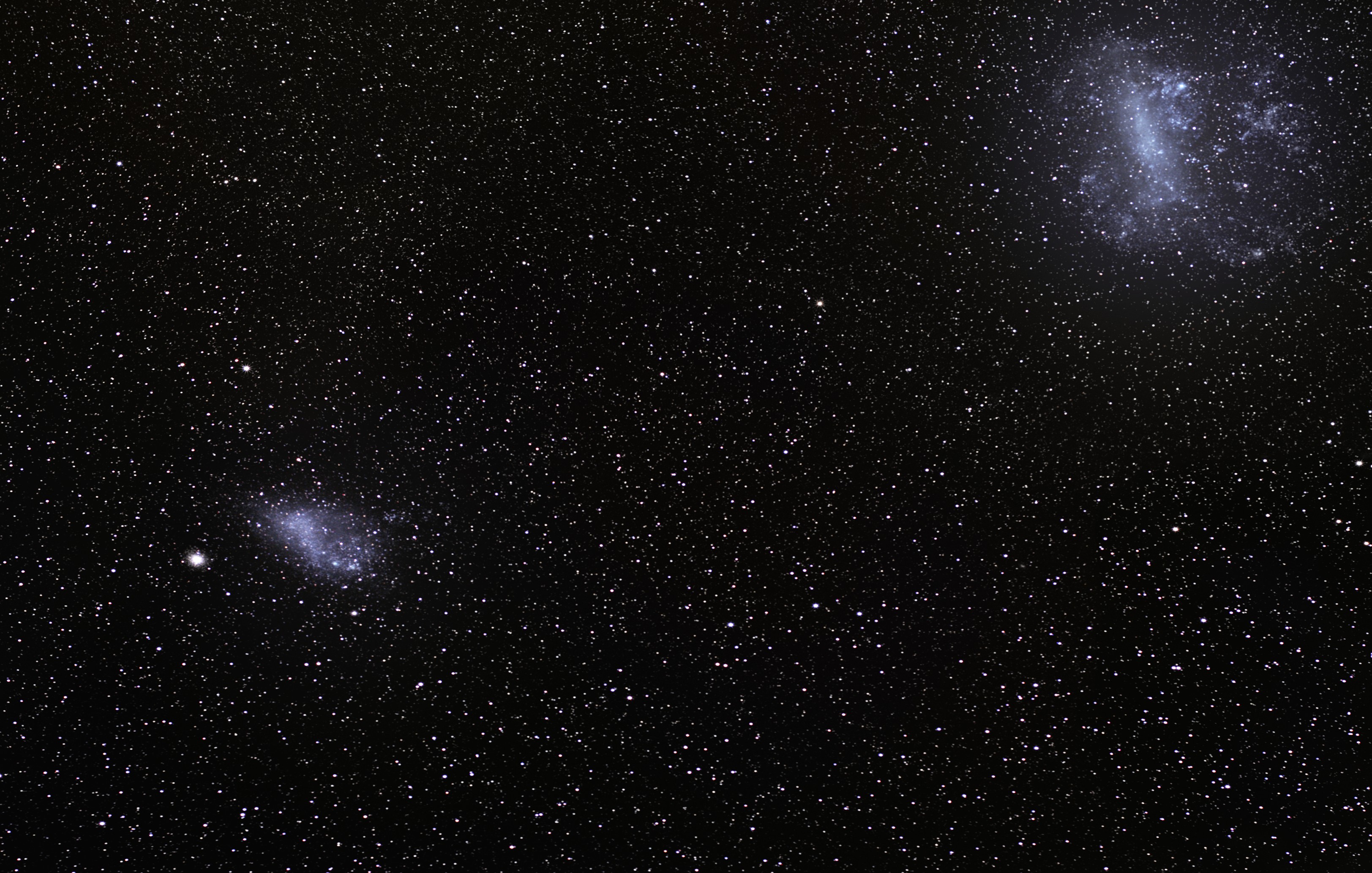 In a dark sky in the south-east are the isolated Large and Small Clouds of Magellan (our galaxy’s nearest neighbours) as well as the vast band of billions of stars and dark dust clouds that make up what we can see of our own galaxy, the Milky Way. In the evenings this month it runs in a broad arc from south to north. From our location about 28,000 light years from the centre of our disc shaped galaxy we have an edge-on view along the plane of the galaxy where the density of stars is greatest. As you look away from the Milky Way to either side of the sky you see far fewer stars. In those directions you are peering through only a thousand or so light years out into intergalactic space, to the north or to the south of the galactic plane. We are still trying to fully understand the size and shape the Milky Way.