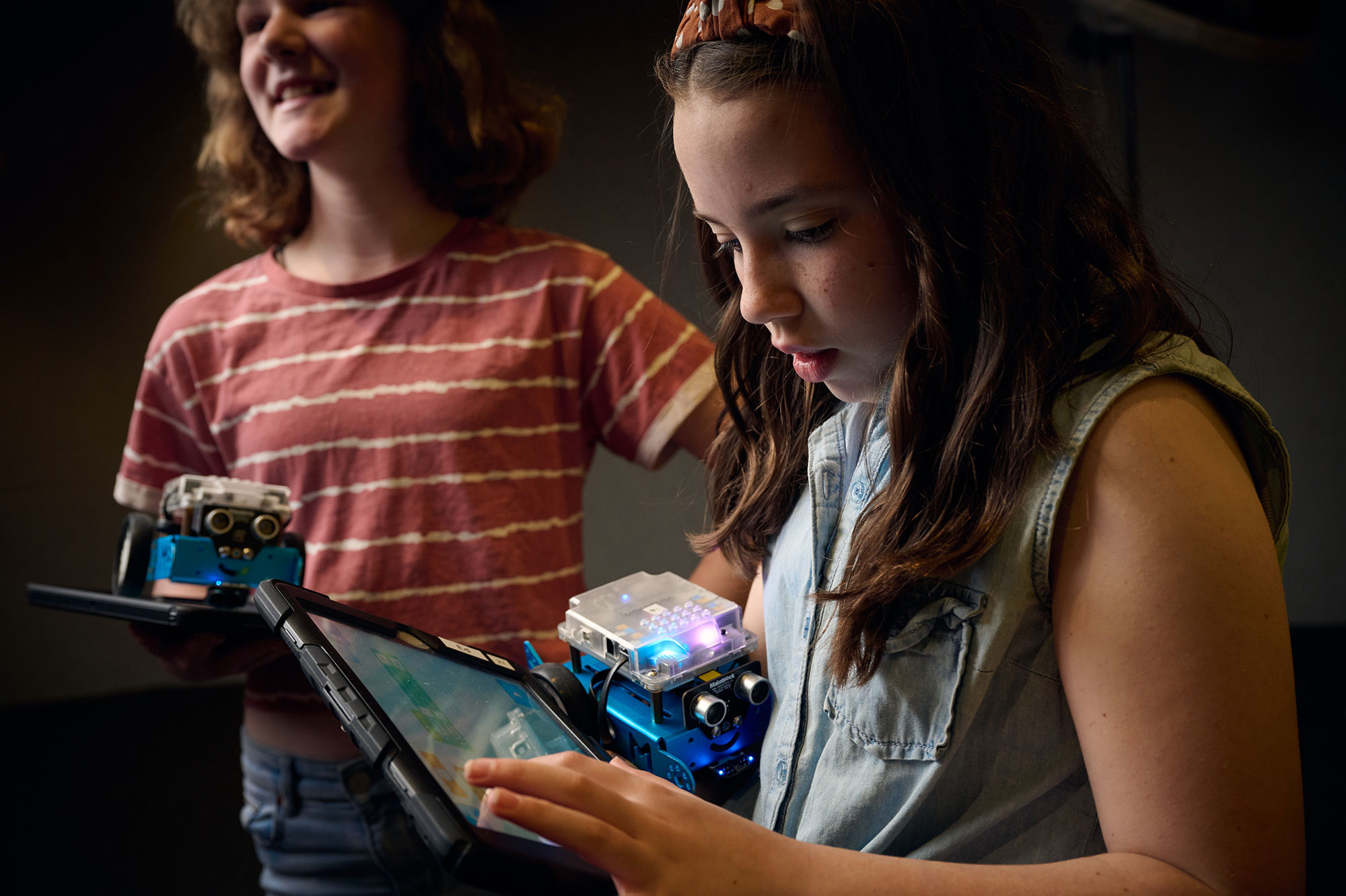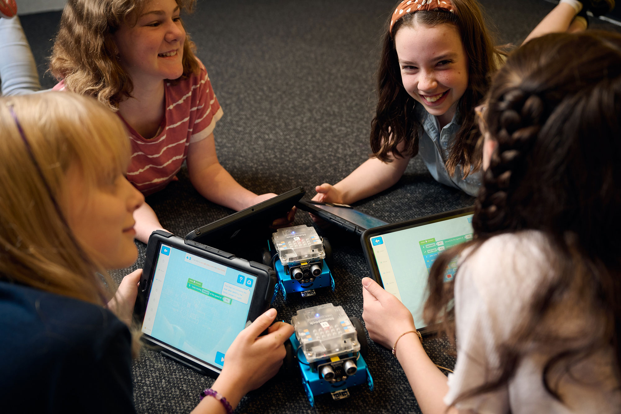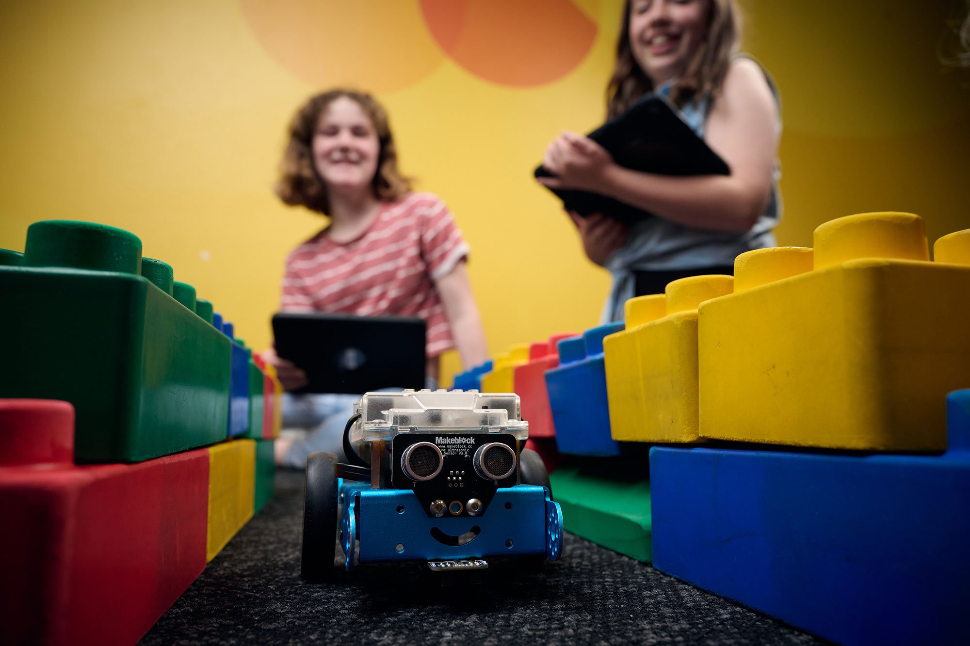 Through hands-on engagement with block-based programming, participants collaborate with mBots and iPads to cultivate essential STEM skills such as problem-solving, creativity, and innovation to tackle challenges and debug code to reach a rewarding final objective.